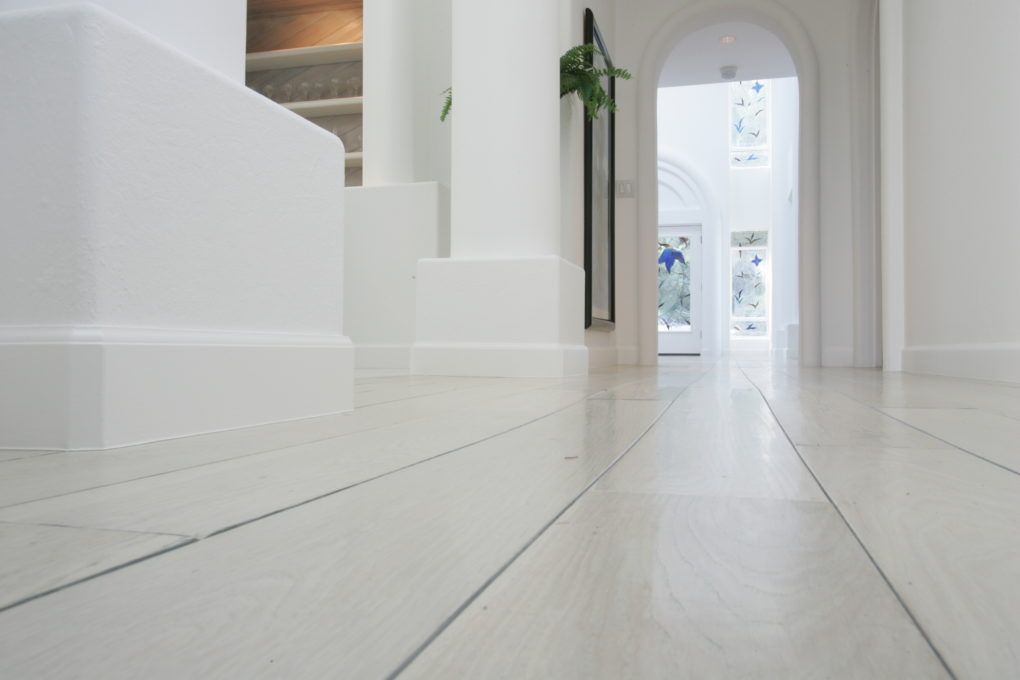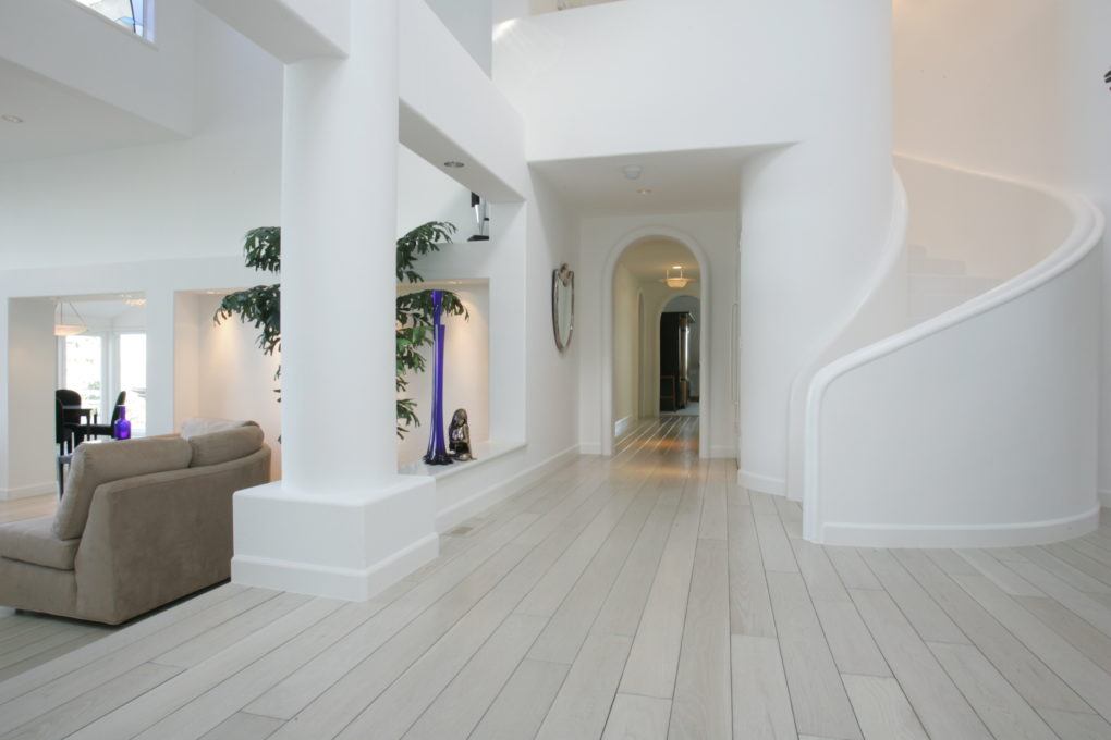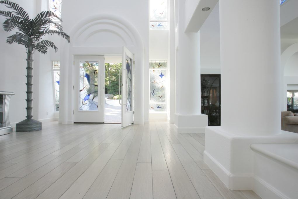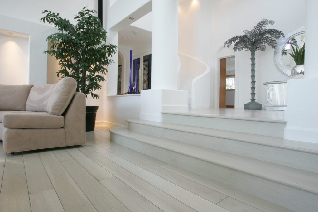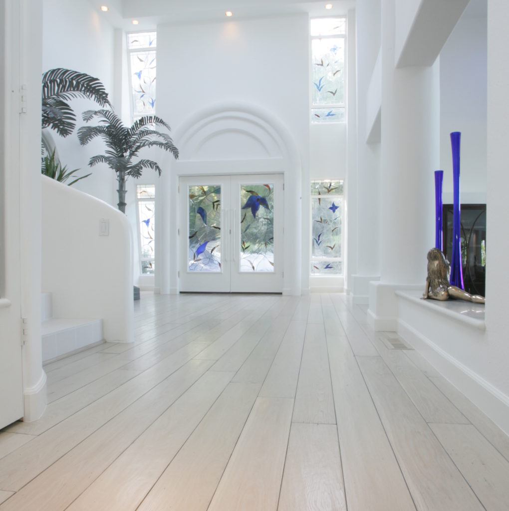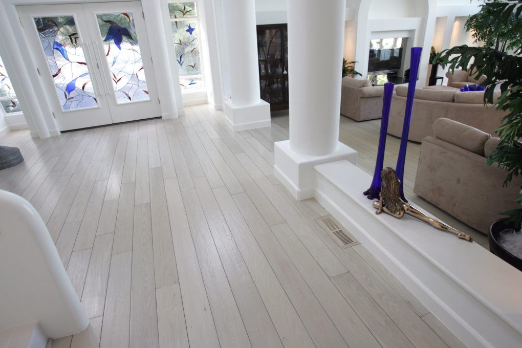 Material: Custom, hand-scraped white oak in a wide plank, white-washed and bleached prior to installation.