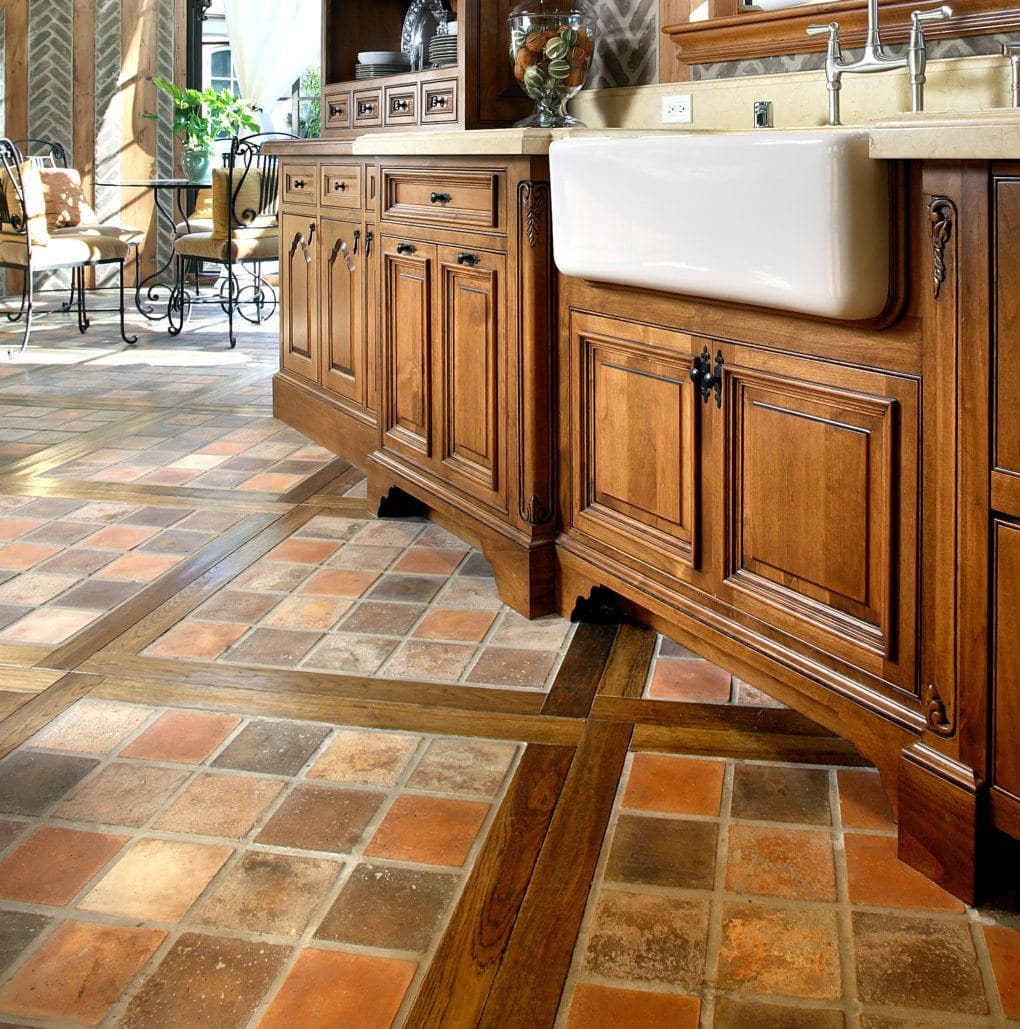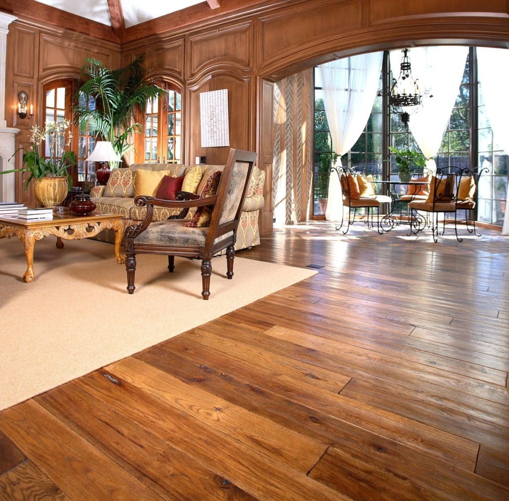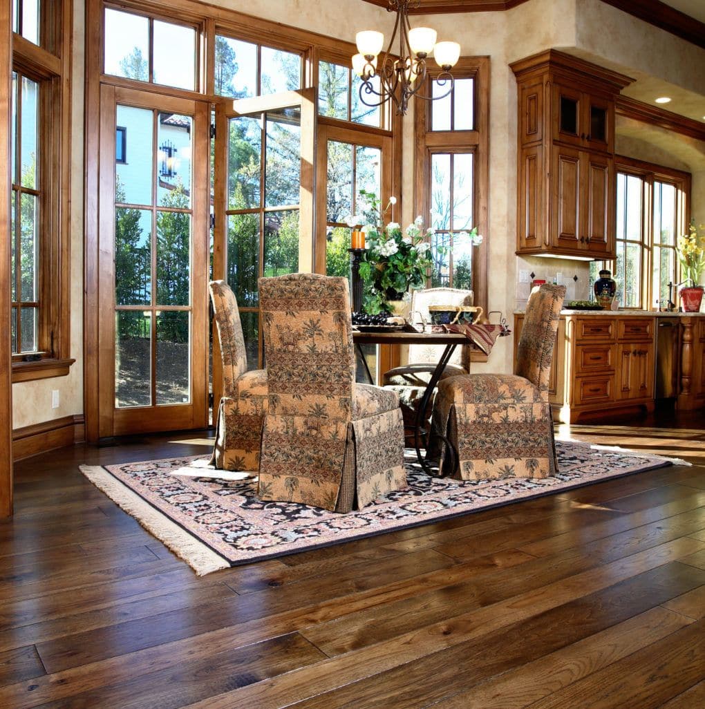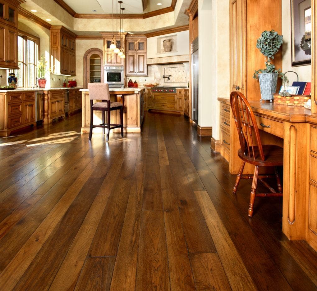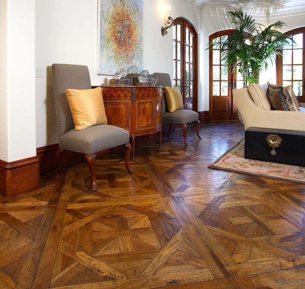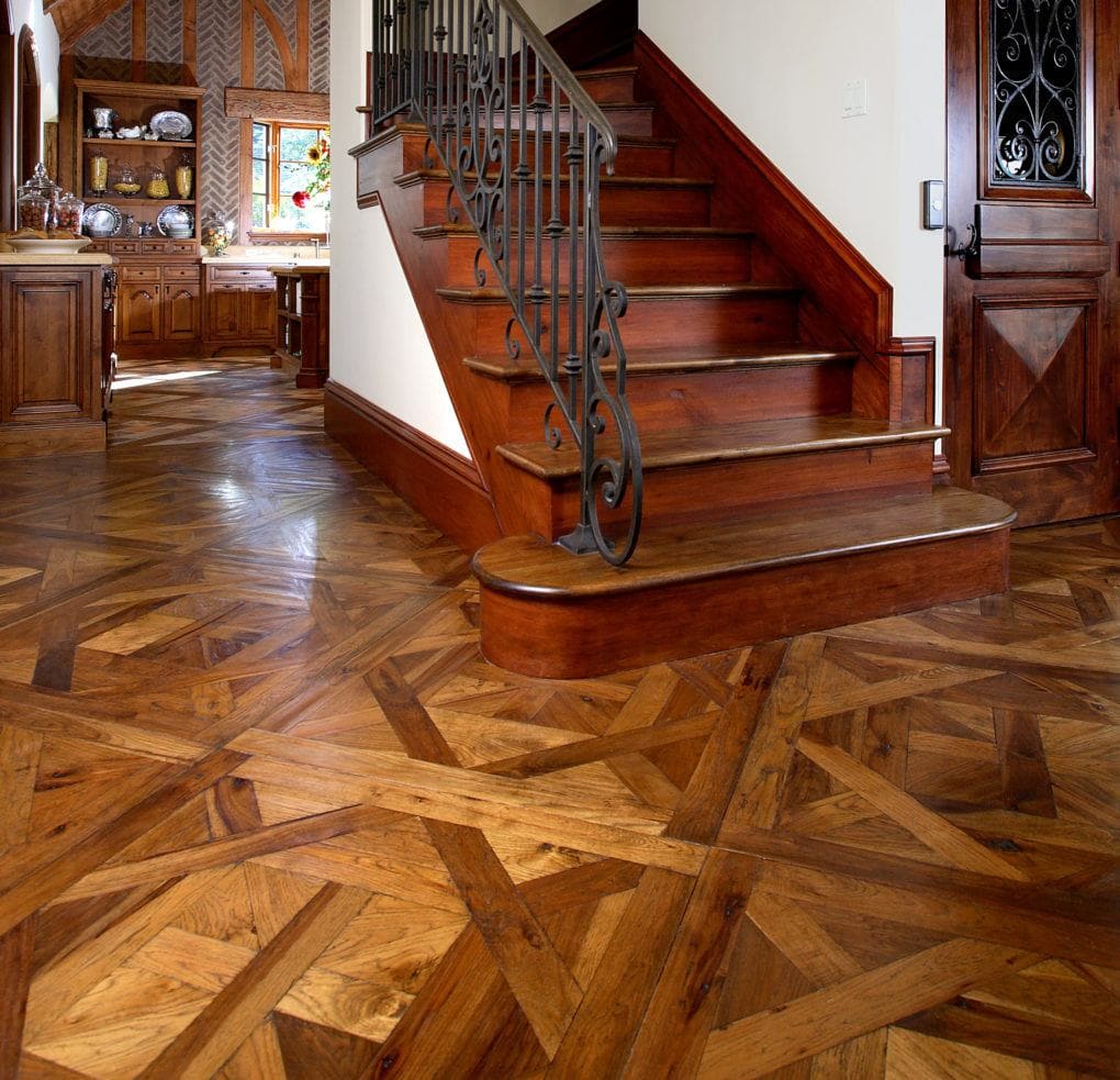 Material: Custom, hand-scraped rustic hickory laid with random width planks and Bordeaux pattern squares.