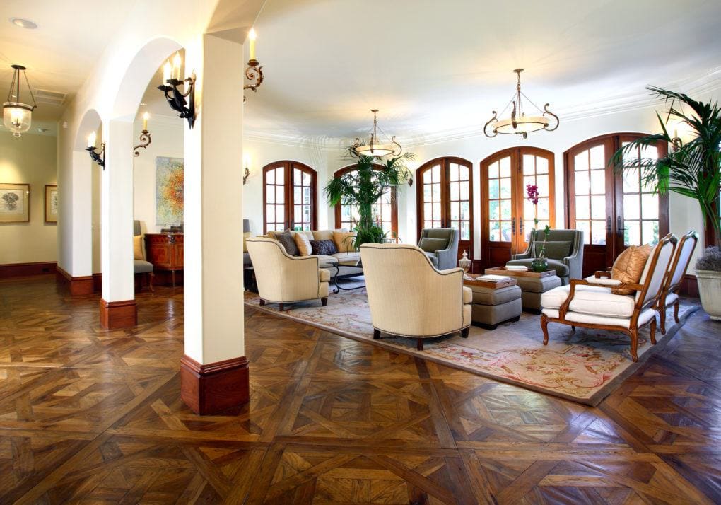 Newly constructed, 4500 sq. foot French chateau-style house, featuring high-end, hand-crafted wood Bordeaux parquet squares. The Bordeaux home also has extensive wood wall paneling and custom designed wrought iron railings.