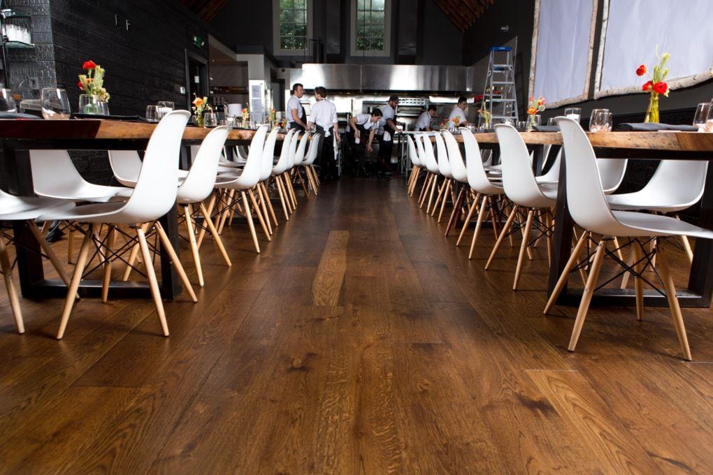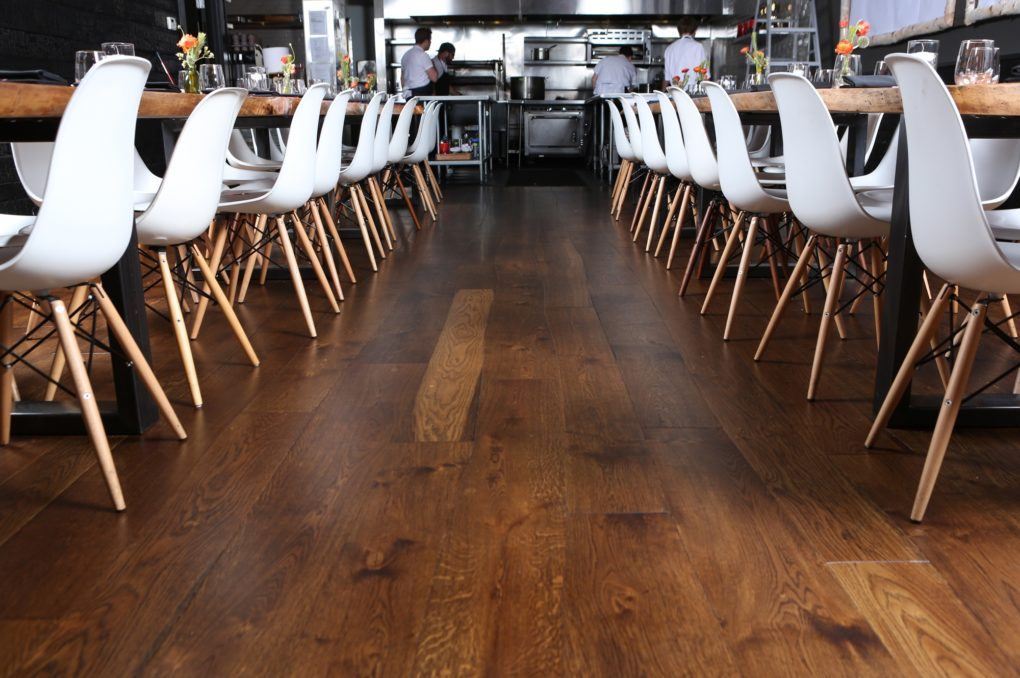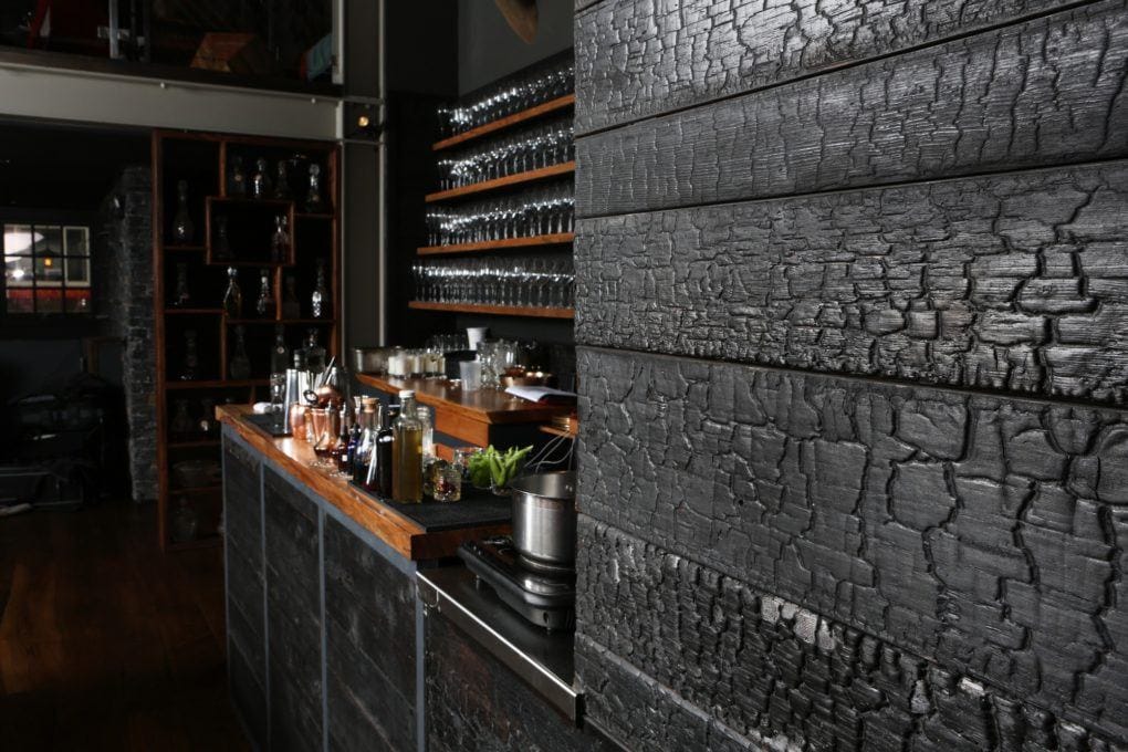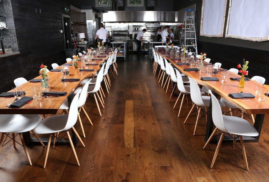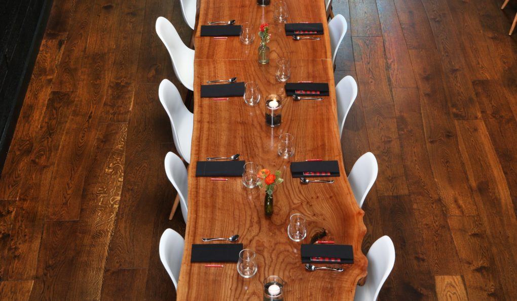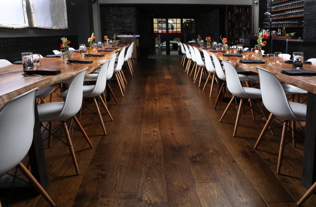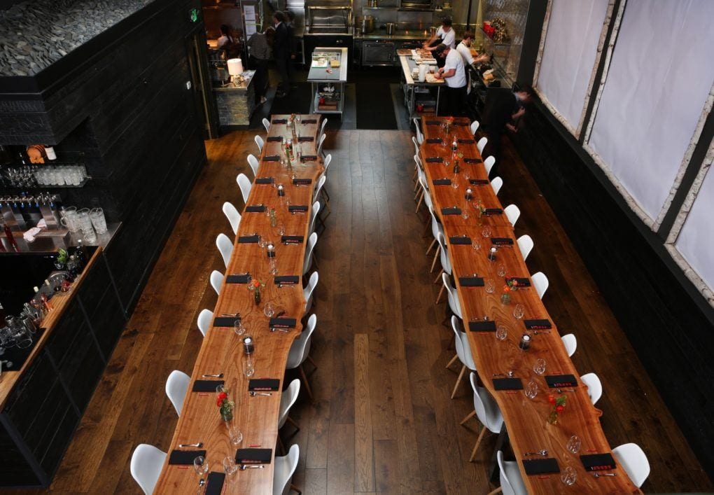 A unique restaurant remodel, Lazy Bear Restaurant features a custom curved wood design in its dining hall.