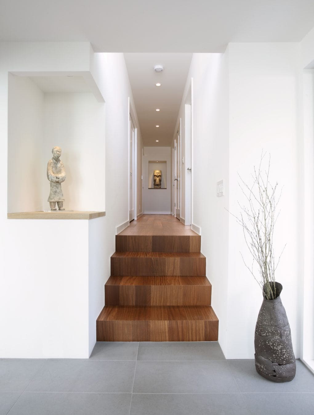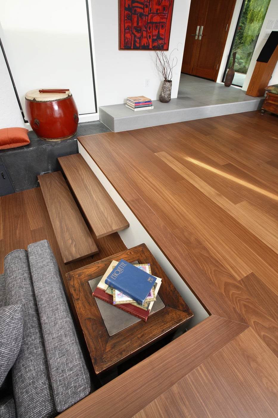 This contemporary residence features Japanese influences with its use of vertical grain, Afromosia flooring. The horizontal and vertical window elements introduce natural light while blocking an uninteresting view. In addition, the recessed family room offers a quiet and contemporary element in the traditional Japanese architectural style.