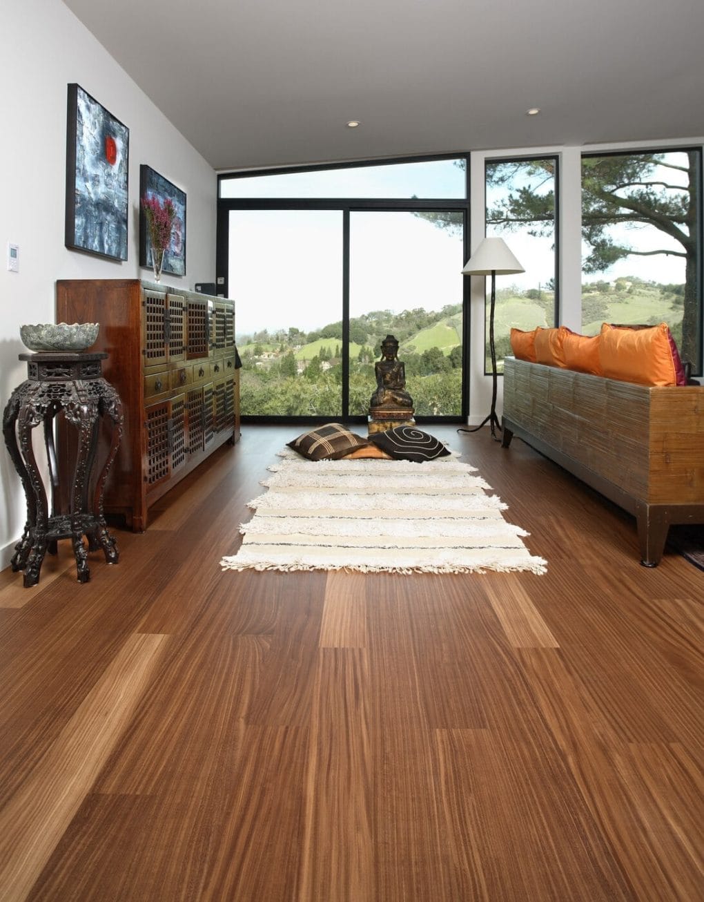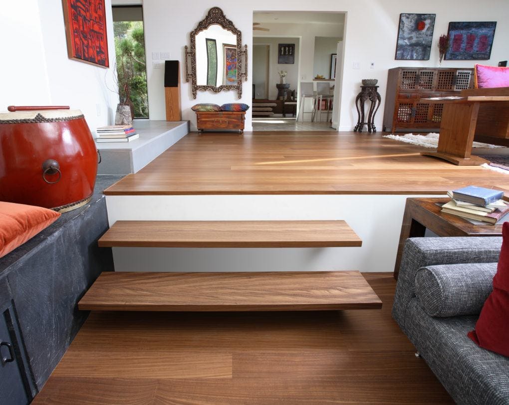 Material: Prefinished, square-edge exotic Afromosia in a wide plank.