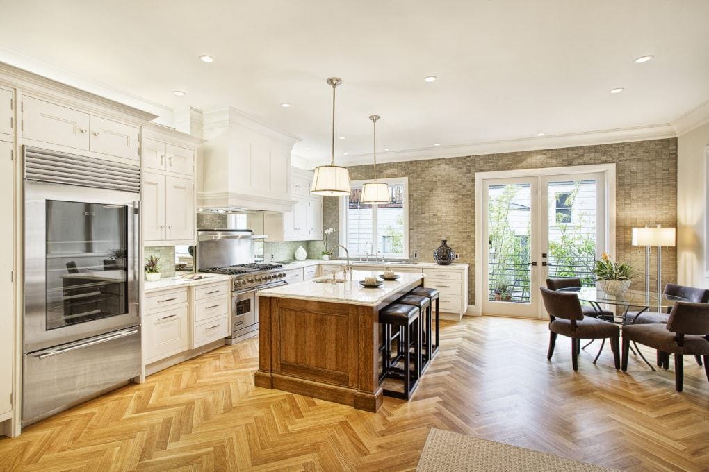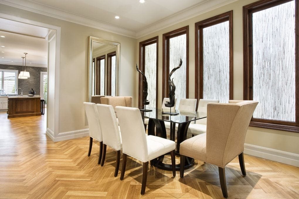 Material: Engineered white oak rift cut with a classic herringbone pattern, and custom stained with an sustainable low voc finish.